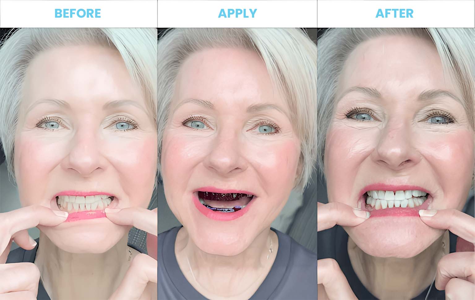 Apply the long strip to your upper teeth, pressing firmly for a secure fit. Repeat with short strip on bottom teeth.