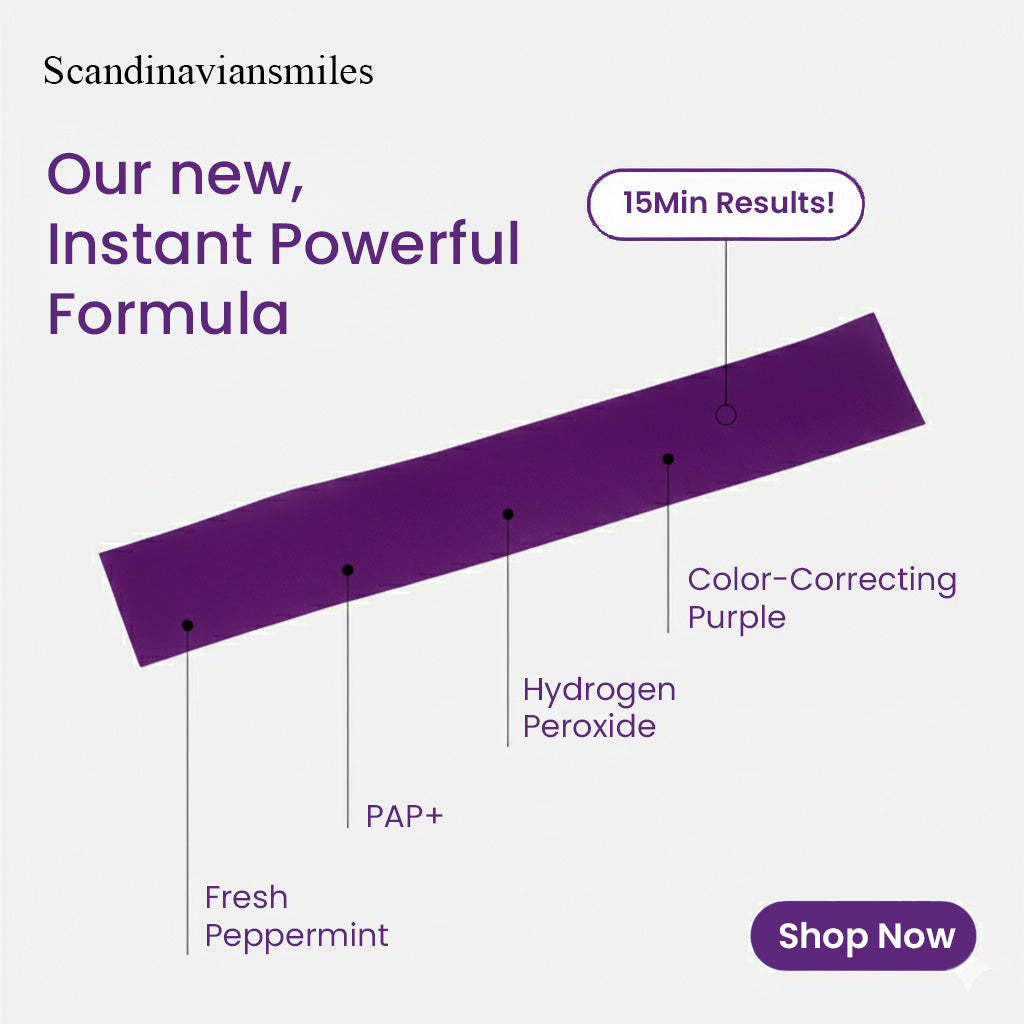 Dual-Action Whitening: Hydrogen Peroxide breaks down surface stains, while PAP gently oxidizes deep discoloration — targeting both intrinsic and extrinsic stains for a radiant, even-toned smile.- Purple-Yellow Color Correction: The violet hue of the strips counteracts yellow tones through optical color balancing, instantly making teeth appear whiter by neutralizing warm discoloration on the enamel surface.
